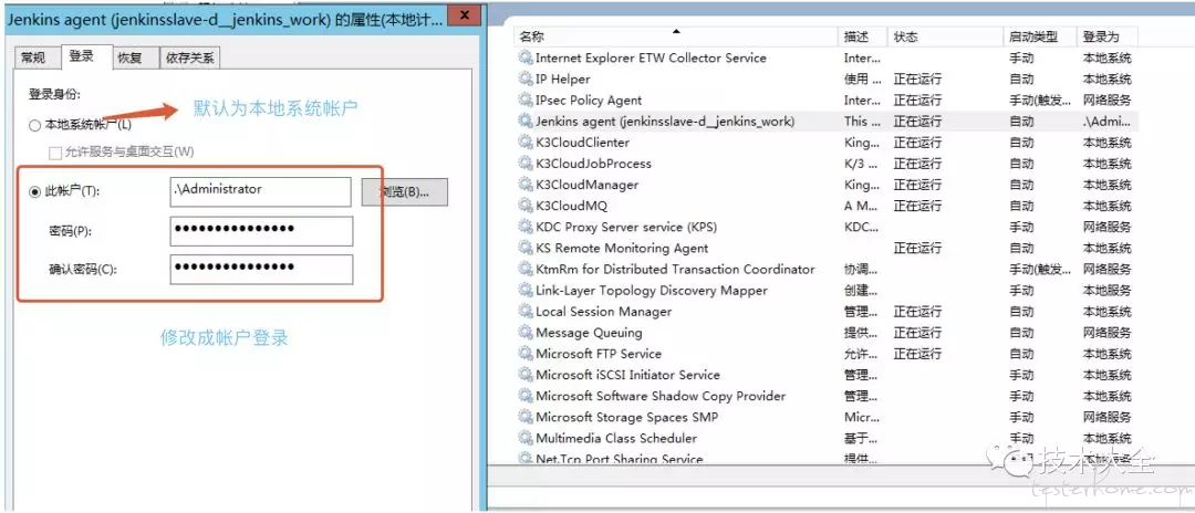 右击我的电脑选择管理然后从管理界面里面找到服务或者在cmd界面输入services.msc打开服务管理界面,从服务管理界面找到jenkins服务,右键点击属性,在弹出的对话框中切换到登陆标签,默认登录方式为本地系统帐号,此处我们选择此账户。然后输入账户和密码点击确定,完成以上操作以后重新启动jenkins服务然后再重新执行即可。