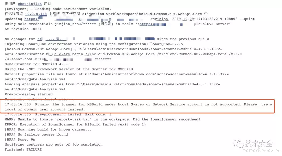 Jenkins +MSBuild+Sonar构建编译Job时提示Running the Scanner for MSBuild under Local System or Network Service account is not supported. Please, use a local or domain user account instead.